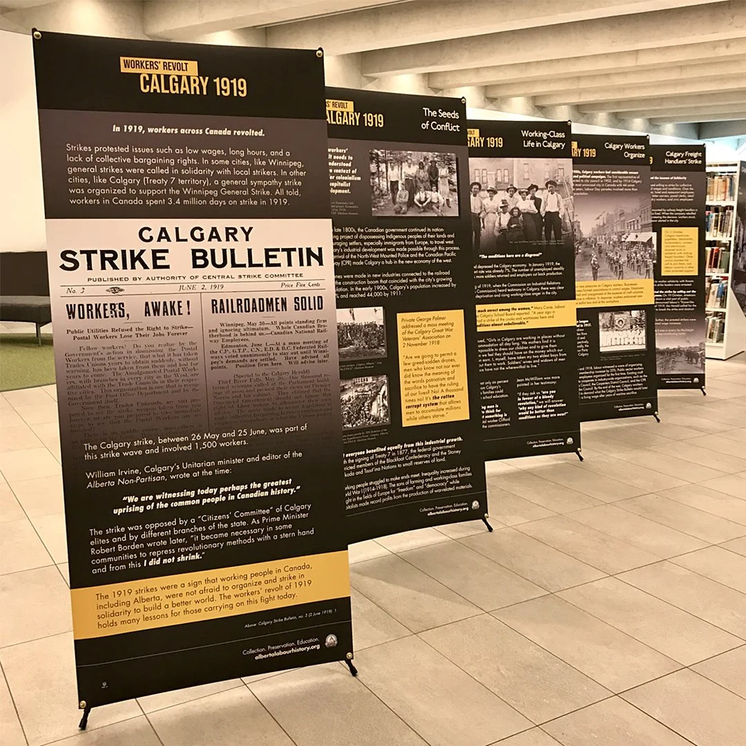 Series of 13 full-size banners describing the 1919 Workers' Revolt in Calgary, Alberta. Marked the revolt's centennial anniversary year. Displayed at Calgary Public Library locations and university student spaces.